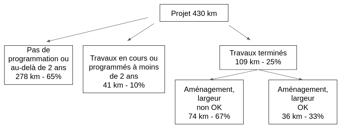 Deux informations objectives sont mesurées par tronçon : l’avancement (travaux terminés, en cours ou programmés à court terme voire non programmés et même renoncé) ainsi que la qualité lorsque les travaux sont réputés terminés : respecte t’on les minimas REV (bon aménagement avec la bonne largeur) ?