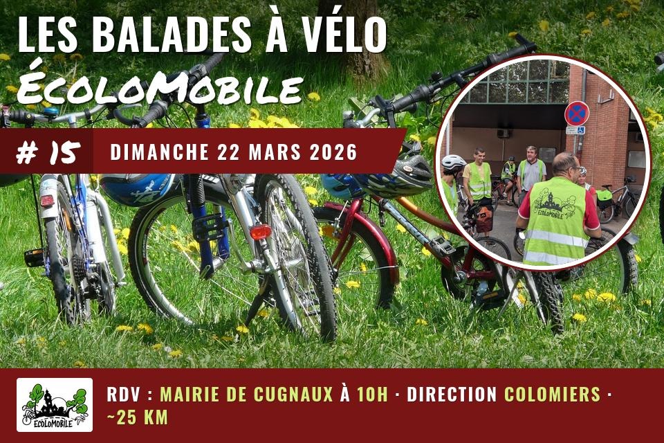 Le dimanche 22 mars 2026 matin aura lieu une balade Écolomobile entre Cugnaux et Colomiers. Balade de 25 km environ.
